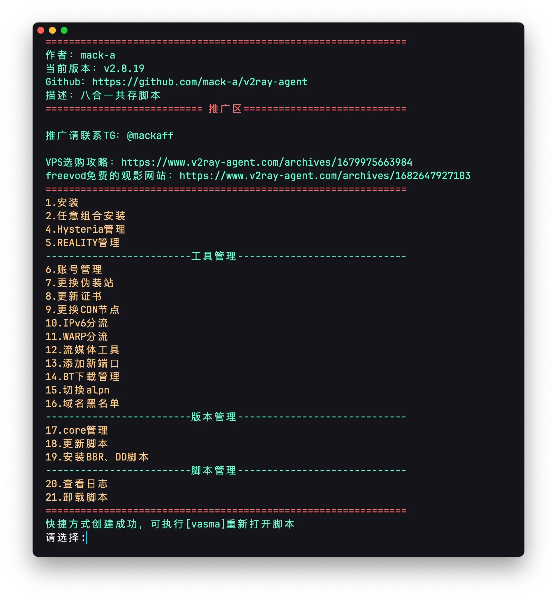 1 | wget -P /root -N --no-check-certificate "https://raw.githubusercontent.com/mack-a/v2ray-agent/master/install.sh" && chmod 700 /root/install.sh && /root/install.sh |