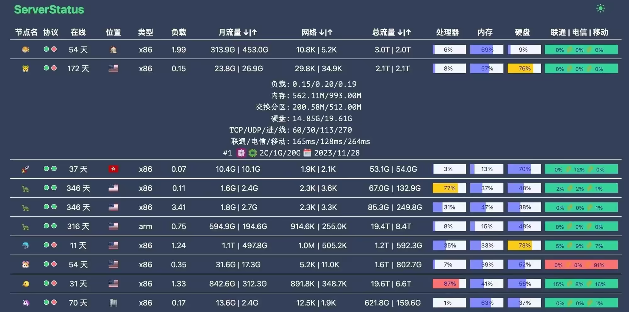 很久以前就看中 ServerStatus 监控面板,感觉就是简洁过头,没有后台,对小白来说搭建也不是太友好,最近发现 Rust 版 ServerStatus 云探针,ServerStatus 威力加强版,保持轻量和简单部署,也支持显示三网 ping 值和丢包率,这样一来,也可以把部署的 smokeping 给删除了