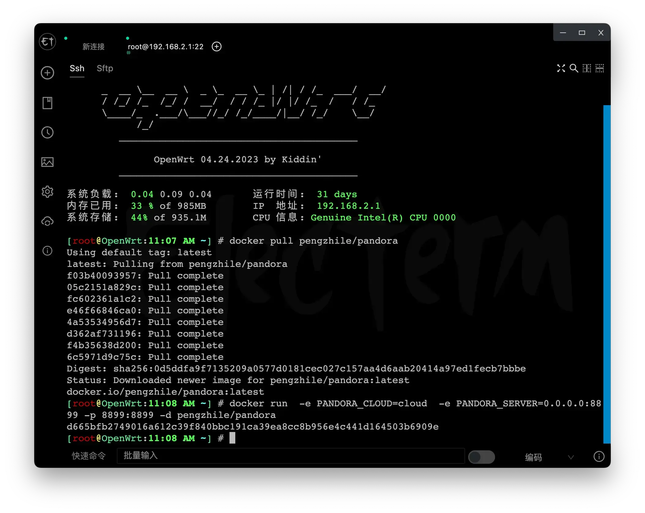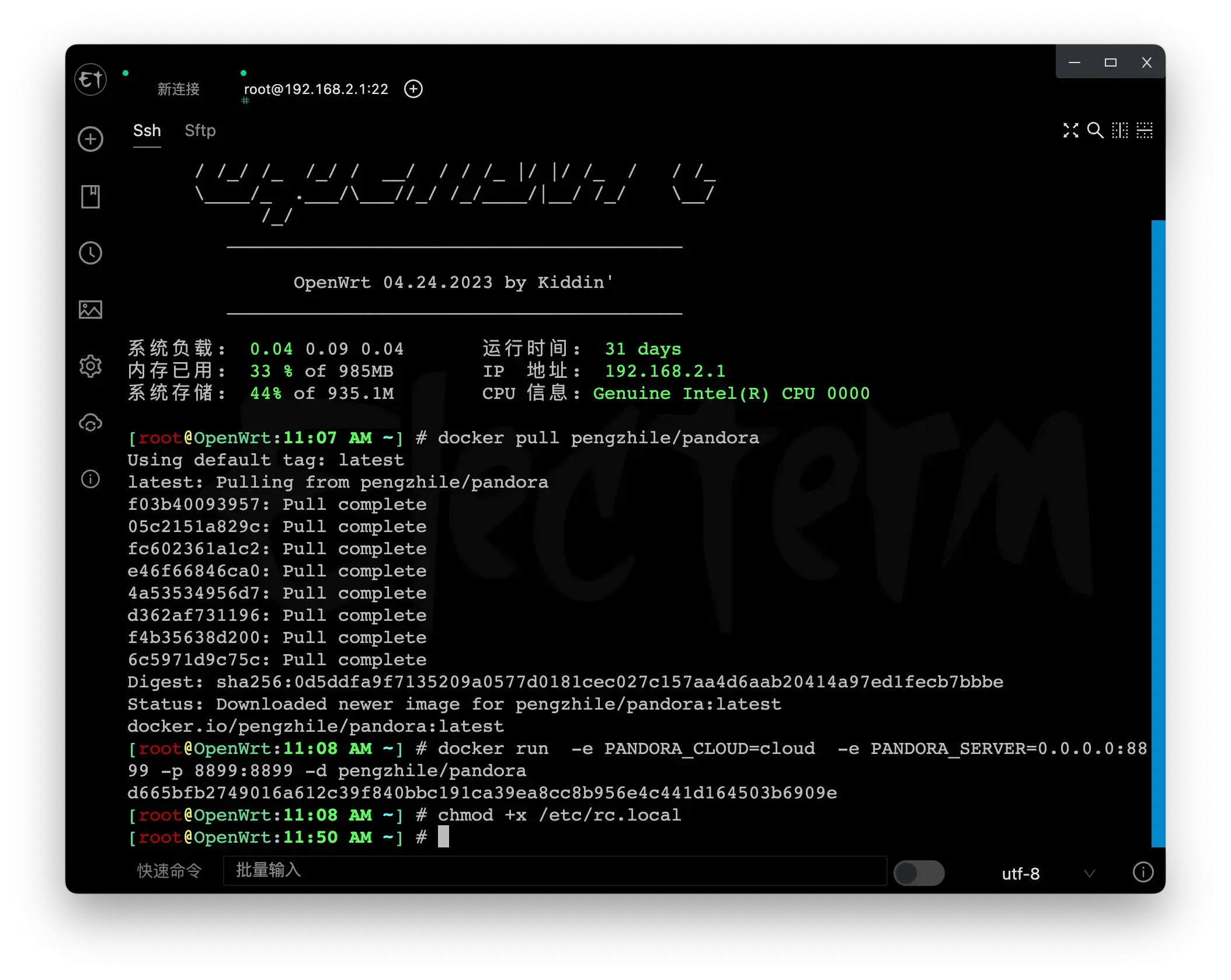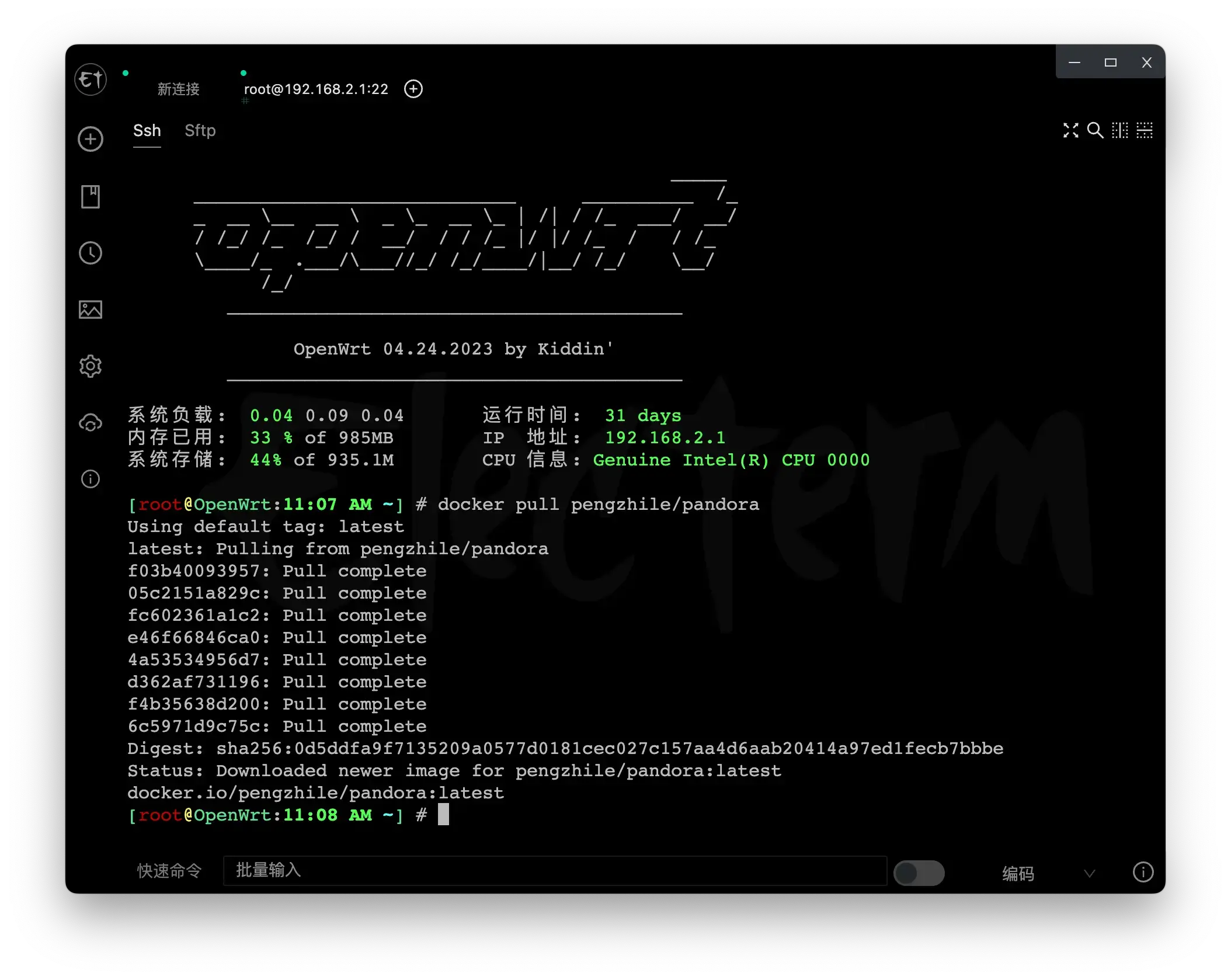 使用 SSH 工具连接 OpenWrt 网关 192.168.2.1,用户名和密码就是 OpenWrt 的用户名和密码。推荐工具 electerm