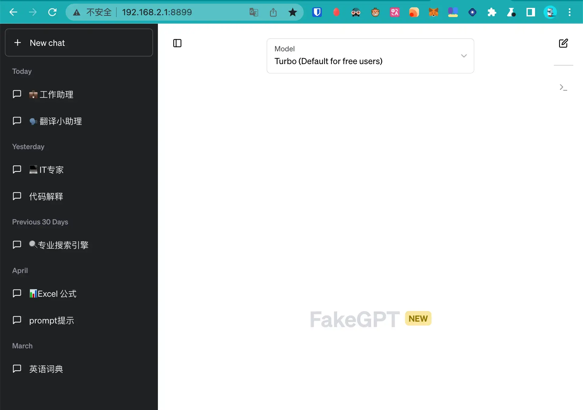 在生活和板砖奔波两地,ChatGPT 官网又经常抽风,碰巧两地都有软路由 OpenWrt,所以我将 ChatGPT 部署到软路由上。两地的网关都是 192.168.2.1,再把软路由上的 ChatGPT 加入 Google Chrome 收藏夹,这样就能随时在两地快速访问。