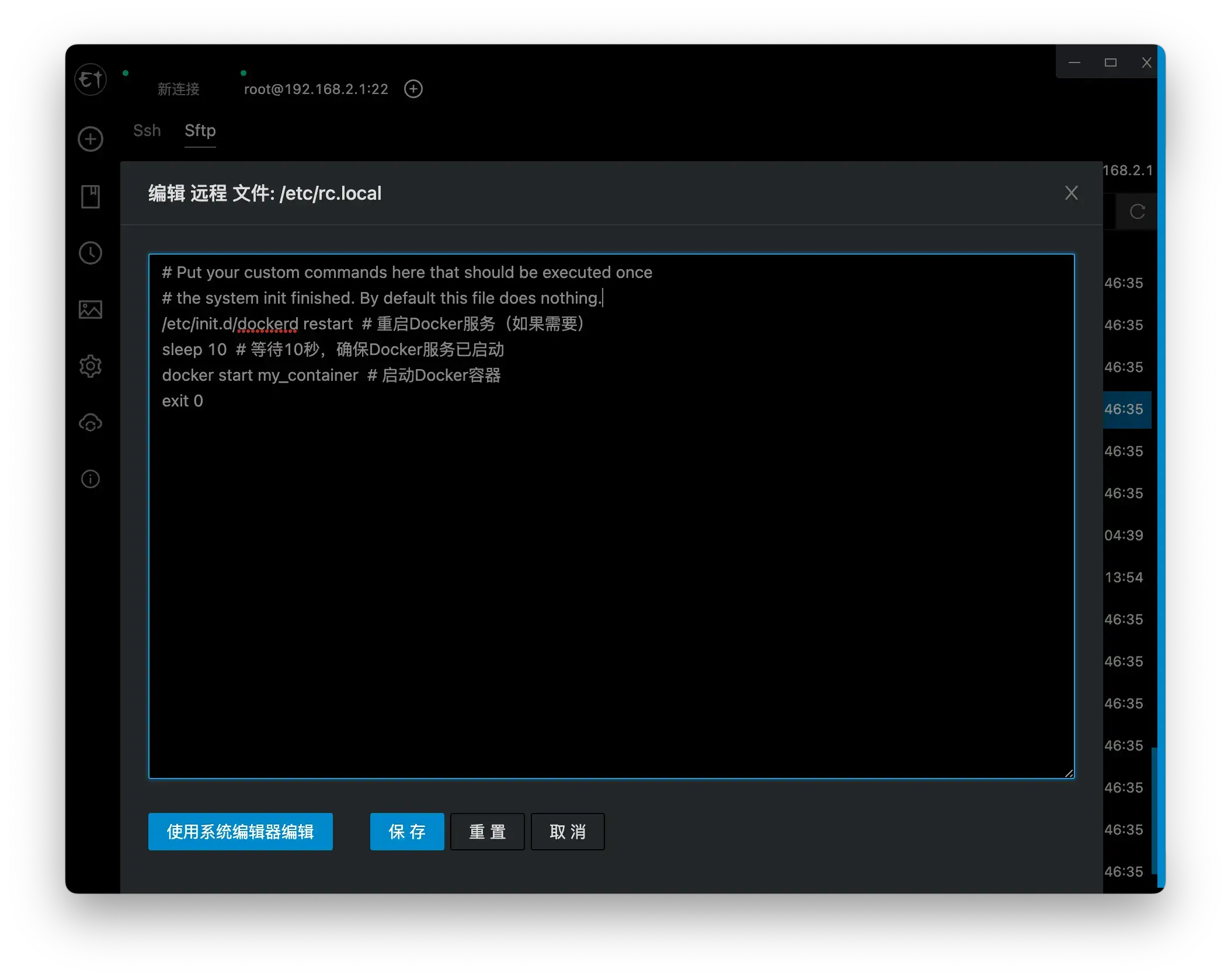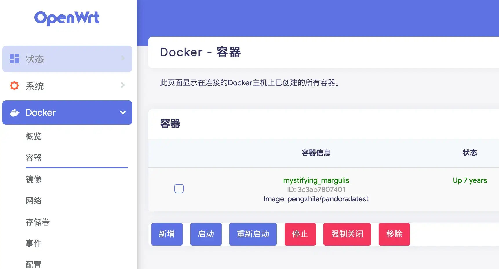 把上面的 docker start my_container 替换成 openwrt Docker 里的容器 ID 比如我的是 3c3ab7807401