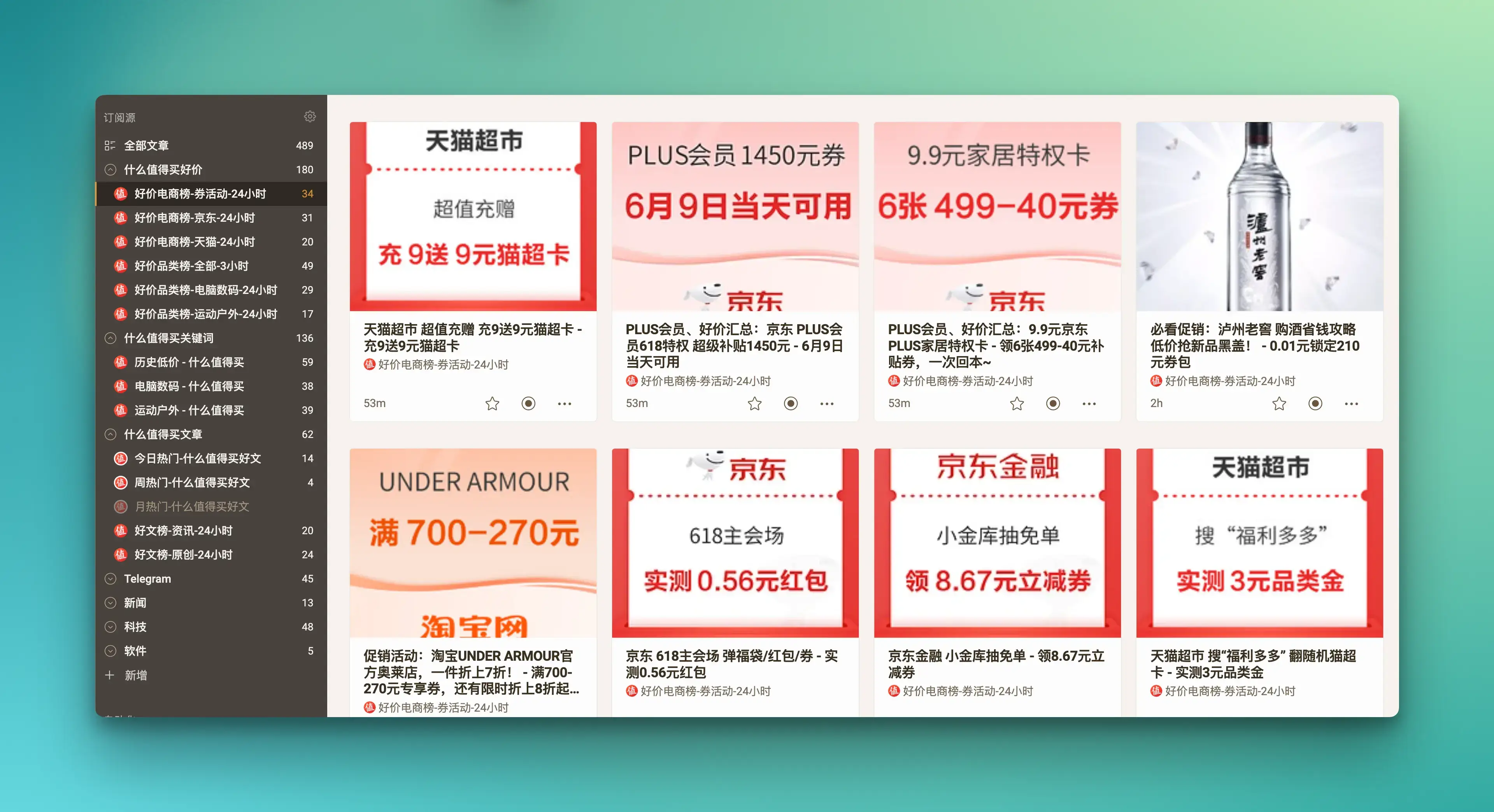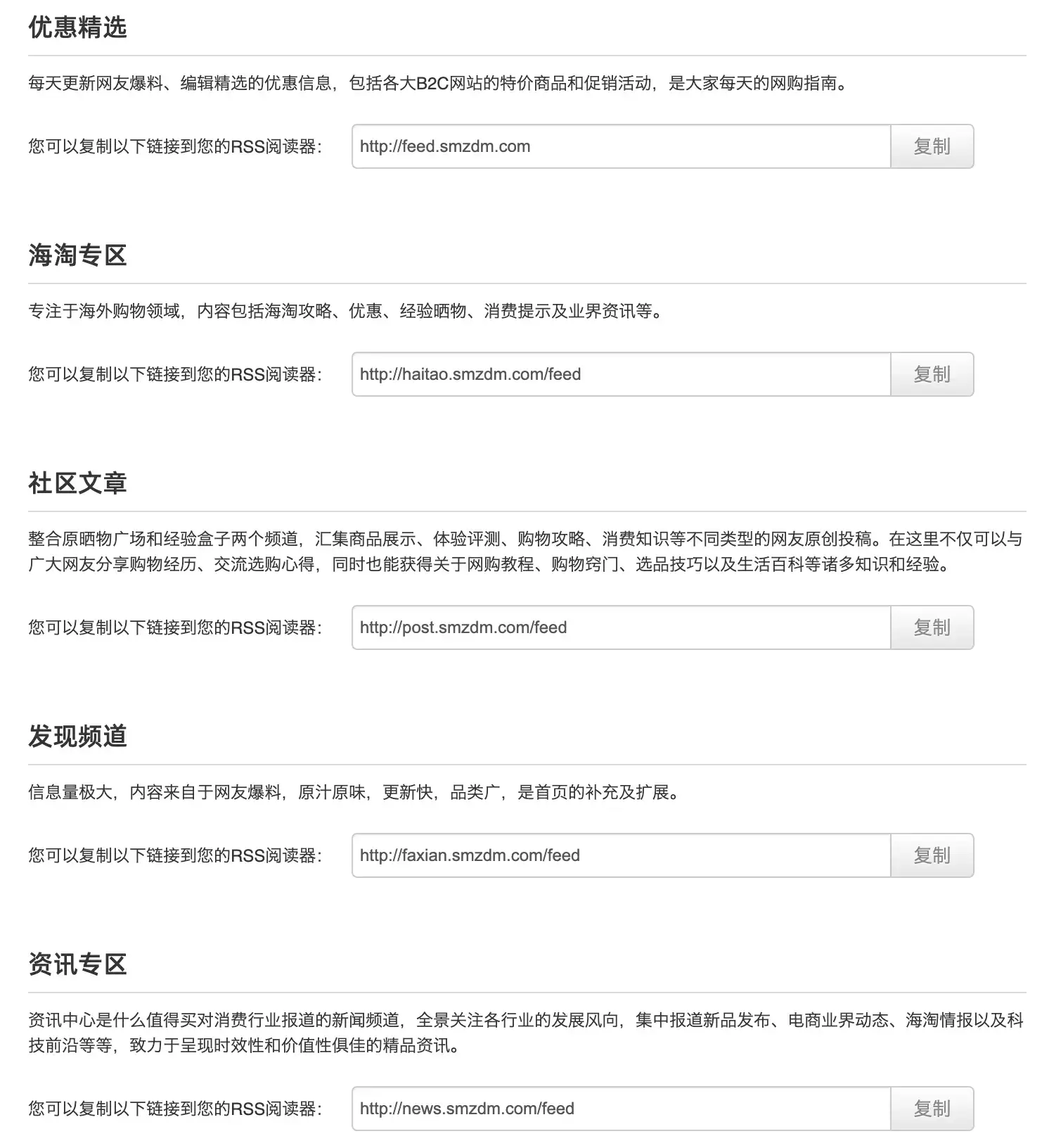 该页面提供非常详细的《什么值得买》RSS 定制频道方法,这里我分享几个自用了频道,大家可以举一反三,客制化自己喜欢的订阅频道。
