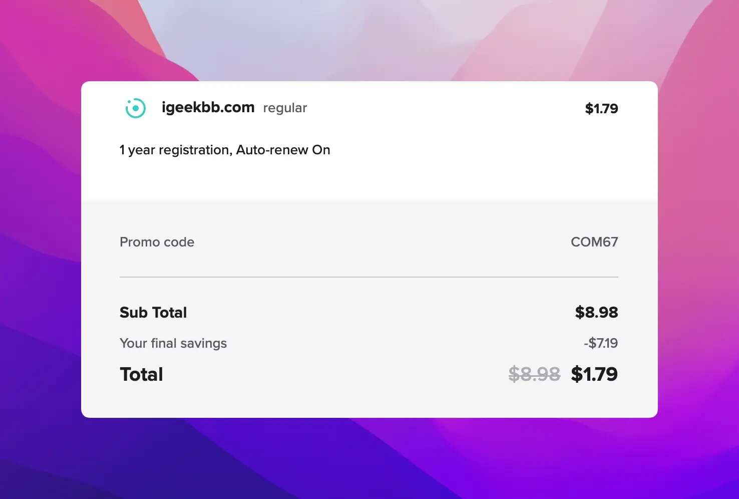 在 Spaceship 用促销代码 COM67 ,仅 1.79 刀购买到我心仪的 COM 域名,次年续费 8.98 刀,还能承受。