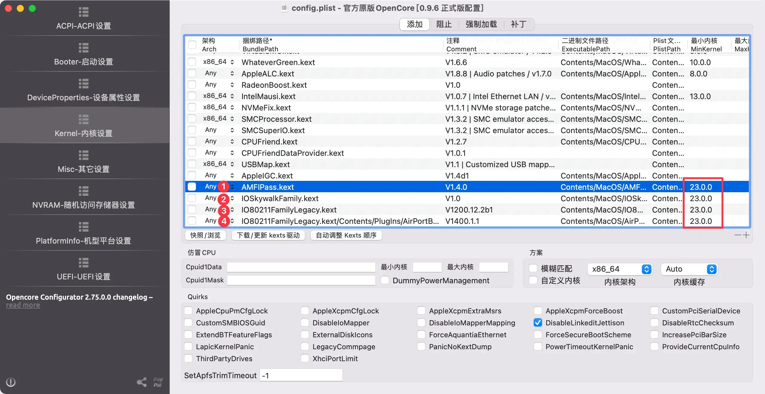 按以下顺序注入三个 kext (一定要按图设置,否则有卡白苹果的风险)