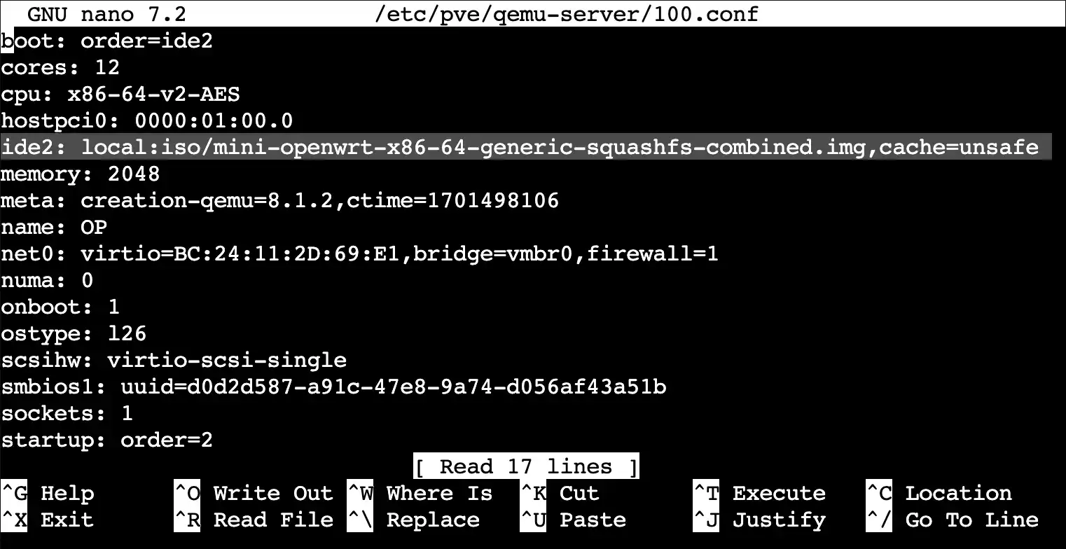在 PVE 下 `Shell` 输入 1 nano /etc/pve/qemu-server/[虚拟机编号].conf