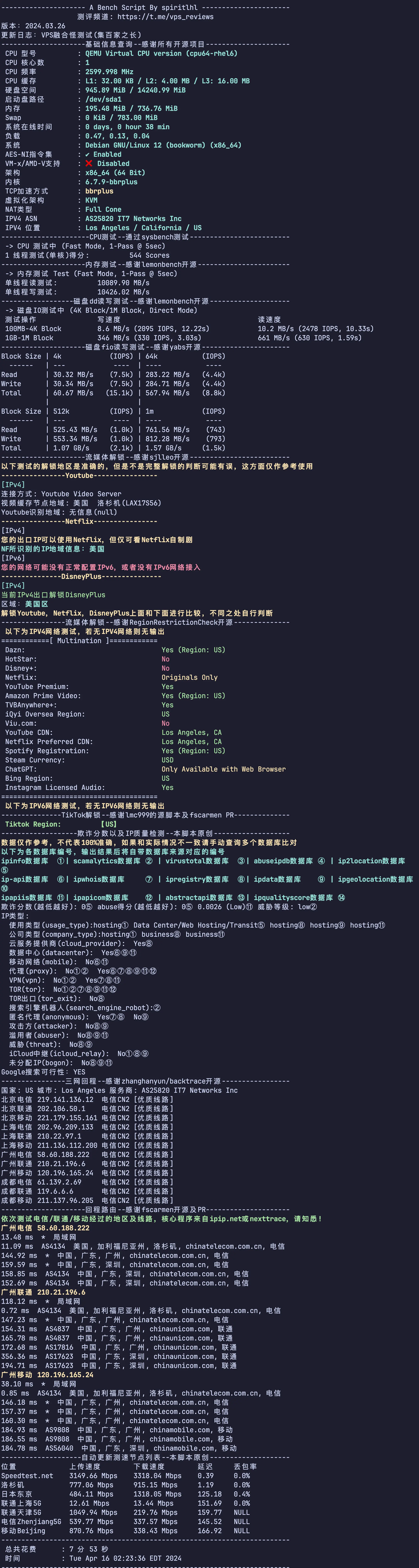 | 测评频道: https://t.me/vps_reviews 版本:2024.03.26 更新日志:VPS融合怪测试(集百家之长) ---------------------基础信息查询--感谢所有开源项目--------------------- CPU 型号 : QEMU Virtual CPU version (cpu64-rhel6) CPU 核心数 : 1 CPU 频率 : 2599.998 MHz CPU 缓存 : L1: 32.00 KB / L2: 4.00 MB / L3: 16.00 MB 硬盘空间 : 945.89 MiB / 14240.99 MiB 启动盘路径 : /dev/sda1 内存 : 195.48 MiB / 736.76 MiB Swap : 0 KiB / 783.00 MiB 系统在线时间 : 0 days, 0 hour 38 min 负载 : 0.47, 0.13, 0.04 系统 : Debian GNU/Linux 12 (bookworm) (x86_64) AES-NI指令集 : ✔ Enabled VM-x/AMD-V支持 : ❌ Disabled 架构 : x86_64 (64 Bit) 内核 : 6.7.9-bbrplus TCP加速方式 : bbrplus 虚拟化架构 : KVM NAT类型 : Full Cone IPV4 ASN : AS25820 IT7 Networks Inc IPV4 位置 : Los Angeles / California / US ----------------------CPU测试--通过sysbench测试------------------------- -> CPU 测试中 (Fast Mode, 1-Pass @ 5sec) 1 线程测试(单核)得分: 544 Scores ---------------------内存测试--感谢lemonbench开源----------------------- -> 内存测试 Test (Fast Mode, 1-Pass @ 5sec) 单线程读测试: 10089.90 MB/s 单线程写测试: 10426.02 MB/s ------------------磁盘dd读写测试--感谢lemonbench开源-------------------- -> 磁盘IO测试中 (4K Block/1M Block, Direct Mode) 测试操作 写速度 读速度 100MB-4K Block 8.6 MB/s (2095 IOPS, 12.22s) 10.2 MB/s (2478 IOPS, 10.33s) 1GB-1M Block 346 MB/s (330 IOPS, 3.03s) 661 MB/s (630 IOPS, 1.59s) ---------------------磁盘fio读写测试--感谢yabs开源---------------------- Block Size | 4k (IOPS) | 64k (IOPS) ------ | --- ---- | ---- ---- Read | 30.32 MB/s (7.5k) | 283.22 MB/s (4.4k) Write | 30.34 MB/s (7.5k) | 284.71 MB/s (4.4k) Total | 60.67 MB/s (15.1k) | 567.94 MB/s (8.8k) | | Block Size | 512k (IOPS) | 1m (IOPS) ------ | --- ---- | ---- ---- Read | 525.43 MB/s (1.0k) | 761.56 MB/s (743) Write | 553.34 MB/s (1.0k) | 812.28 MB/s (793) Total | 1.07 GB/s (2.1k) | 1.57 GB/s (1.5k) ---------------------流媒体解锁--感谢sjlleo开源------------------------- 以下测试的解锁地区是准确的,但是不是完整解锁的判断可能有误,这方面仅作参考使用 ----------------Youtube---------------- [IPv4] 连接方式: Youtube Video Server 视频缓存节点地域: 美国 洛杉机(LAX17S56) Youtube识别地域: 无信息(null) ----------------Netflix---------------- [IPv4] 您的出口IP可以使用Netflix,但仅可看Netflix自制剧 NF所识别的IP地域信息:美国 [IPv6] 您的网络可能没有正常配置IPv6,或者没有IPv6网络接入 ---------------DisneyPlus--------------- [IPv4] 当前IPv4出口解锁DisneyPlus 区域:美国区 解锁Youtube,Netflix,DisneyPlus上面和下面进行比较,不同之处自行判断 ----------------流媒体解锁--感谢RegionRestrictionCheck开源-------------- 以下为IPV4网络测试,若无IPV4网络则无输出 ============[ Multination ]============ Dazn: Yes (Region: US) HotStar: No Disney+: No Netflix: Originals Only YouTube Premium: Yes Amazon Prime Video: Yes (Region: US) TVBAnywhere+: Yes iQyi Oversea Region: US Viu.com: No YouTube CDN: Los Angeles, CA Netflix Preferred CDN: Los Angeles, CA Spotify Registration: Yes (Region: US) Steam Currency: USD ChatGPT: Only Available with Web Browser Bing Region: US Instagram Licensed Audio: -> Instagram Licensed Audio: Yes ======================================= 以下为IPV6网络测试,若无IPV6网络则无输出 ---------------TikTok解锁--感谢lmc999的源脚本及fscarmen PR-------------- Tiktok Region: 【US】 -------------------欺诈分数以及IP质量检测--本脚本原创------------------- 数据仅作参考,不代表100%准确,如果和实际情况不一致请手动查询多个数据库比对 以下为各数据库编号,输出结果后将自带数据库来源对应的编号 ipinfo数据库 ① | scamalytics数据库 ② | virustotal数据库 ③ | abuseipdb数据库 ④ | ip2location数据库 ⑤ ip-api数据库 ⑥ | ipwhois数据库 ⑦ | ipregistry数据库 ⑧ | ipdata数据库 ⑨ | ipgeolocation数据库 ⑩ ipapiis数据库 ⑪ | ipapicom数据库 ⑫ | abstractapi数据库 ⑬ | ipqualityscore数据库 ⑭ 欺诈分数(越低越好): 0⑤ abuse得分(越低越好): 0⑤ 0.0026 (Low)⑪ 威胁等级: low② IP类型: 使用类型(usage_type):hosting① Data Center/Web Hosting/Transit⑤ hosting⑧ hosting⑨ hosting⑪ 公司类型(company_type):hosting① business⑧ business⑪ 云服务提供商(cloud_provider): Yes⑧ 数据中心(datacenter): Yes⑥ ⑨ ⑪ 移动网络(mobile): No⑥ ⑪ 代理(proxy): No① ② Yes⑥ ⑦ ⑧ ⑨ ⑪ ⑫ VPN(vpn): No① ② Yes⑦ ⑧ ⑪ TOR(tor): No① ② ⑦ ⑧ ⑨ ⑪ ⑫ TOR出口(tor_exit): No⑧ 搜索引擎机器人(search_engine_robot):② 匿名代理(anonymous): Yes⑦ ⑧ No⑨ 攻击方(attacker): No⑧ ⑨ 滥用者(abuser): No⑧ ⑨ ⑪ 威胁(threat): No⑧ ⑨ iCloud中继(icloud_relay): No① ⑧ ⑨ 未分配IP(bogon): No⑧ ⑨ ⑪ Google搜索可行性:YES ----------------三网回程--感谢zhanghanyun/backtrace开源----------------- 国家: US 城市: Los Angeles 服务商: AS25820 IT7 Networks Inc 北京电信 219.141.136.12 电信CN2 [优质线路] 北京联通 202.106.50.1 电信CN2 [优质线路] 北京移动 221.179.155.161 电信CN2 [优质线路] 上海电信 202.96.209.133 电信CN2 [优质线路] 上海联通 210.22.97.1 电信CN2 [优质线路] 上海移动 211.136.112.200 电信CN2 [优质线路] 广州电信 58.60.188.222 电信CN2 [优质线路] 广州联通 210.21.196.6 电信CN2 [优质线路] 广州移动 120.196.165.24 电信CN2 [优质线路] 成都电信 61.139.2.69 电信CN2 [优质线路] 成都联通 119.6.6.6 电信CN2 [优质线路] 成都移动 211.137.96.205 电信CN2 [优质线路] ---------------------回程路由--感谢fscarmen开源及PR--------------------- 依次测试电信/联通/移动经过的地区及线路,核心程序来自ipip.net或nexttrace